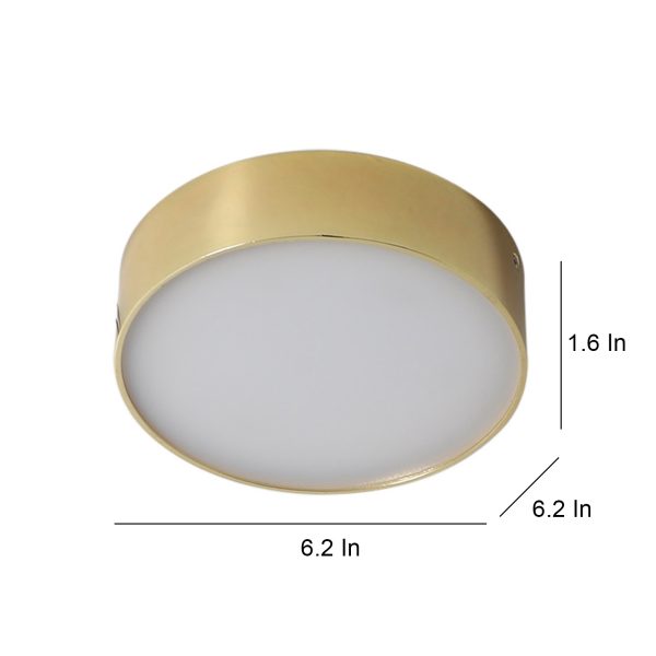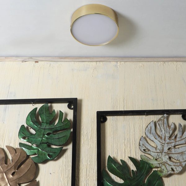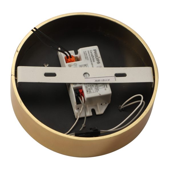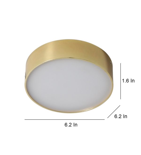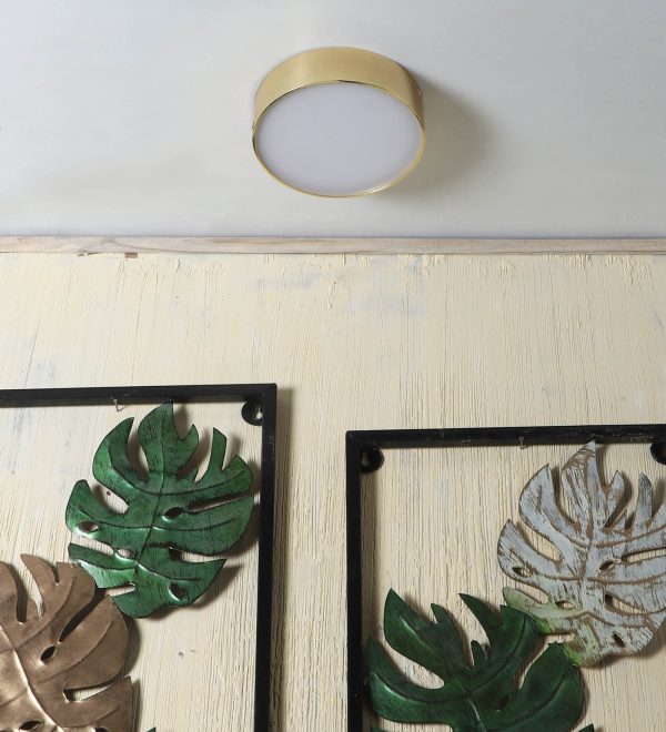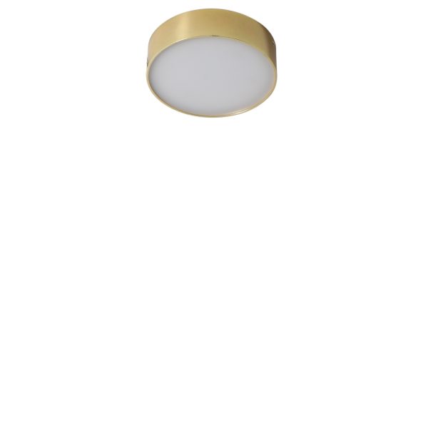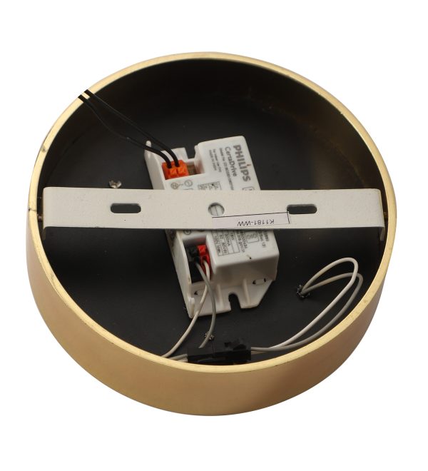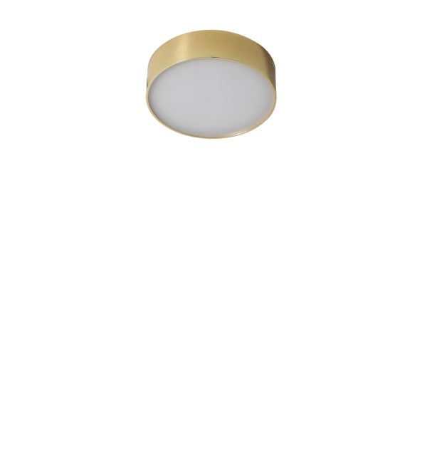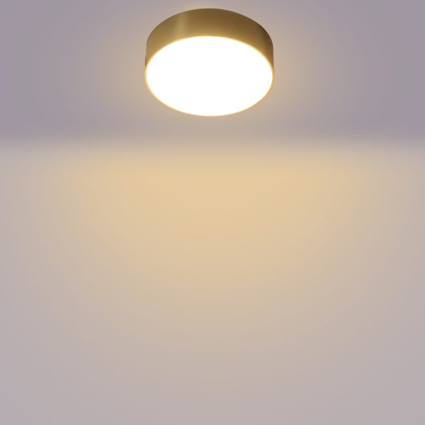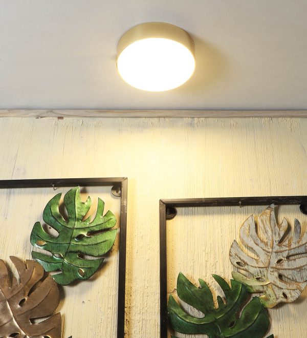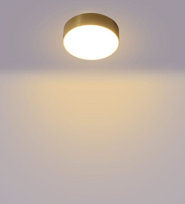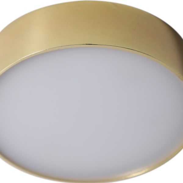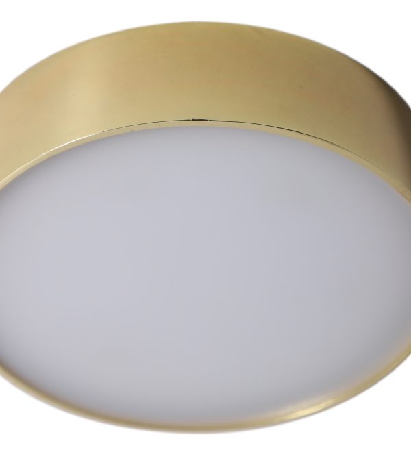 Gold (glossy) finish round LED surface ceiling light with warm white (yellow) light output. Can be used both indoors and outdoors. Can be customised as per requirement in terms of body colour, colour of light output and wattage.