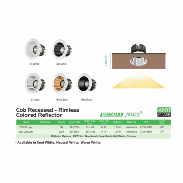 LEARC aluminium rose gold reflector detachable, tiltable anti glare 12 watt Trimless LED down light.