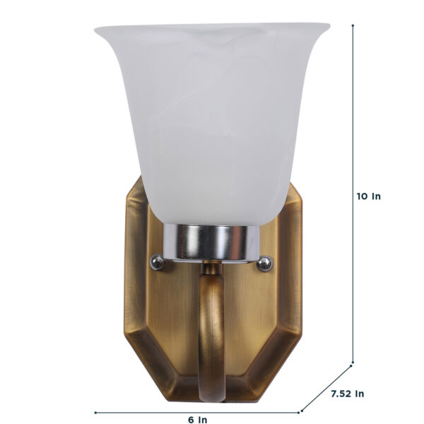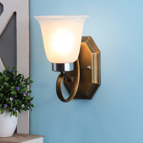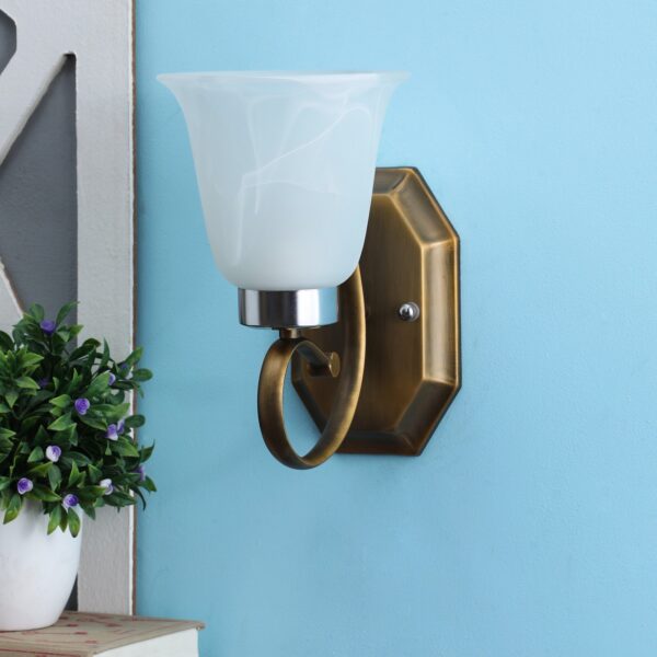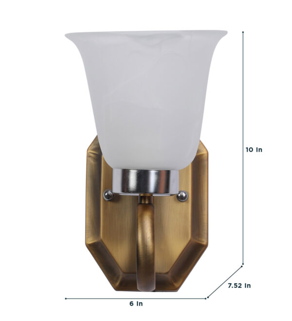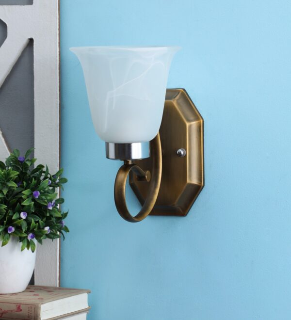 Antique brass, chrome finish single wall light having bell shaped, white glass having a self textured design made of mild steel. Looks amazing when lit. It is maintenance free. It is easy to remove glass and wash it. Comes with an E27 holder, only the change of lamp is required, which is available locally everywhere. Application includes both residential and commercial premises wherever it matches with your interiors. Matching double wall light code – WL1931. Matching chandelier code – CH376. Can be customized as per requirement in case of bulk quantities. Lamp not included.