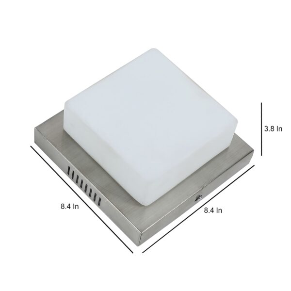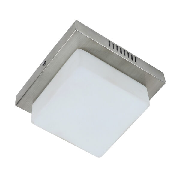 Square aluminium sheet / mild steel powder coated outdoor ceiling light having one lamp in silver (satin nickel) finish providing light in 360 degree. It is maintenance free, comes with an E27 holder, only the change of lamp is required, which is available locally everywhere You can of course swap out the bulb for one that is dimmable, has a higher light output or a different colour temperature. Application areas include porche, enterance, patio, verandah, balcony, bathroom, staircase ceiling, terrace, stilt parking, basement parking Have a bigger size with two lamp option with code CL451-M. LAMP NOT INCLUDED.