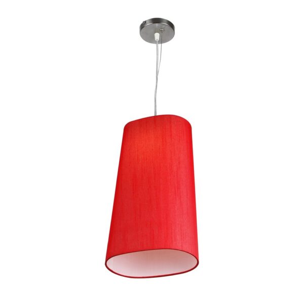 Red hanging light with oval long fabric shade and mild steel attachment in Silver (satin nickel) finish. The suspension can be adjusted at time of installation to the desired height. Extremely good for hotel rooms when installed with matching wall light. It is maintenance free, comes with an E27 holder, only the change of lamp is required, which is available locally everywhere. Application includes both residential and commercial premises wherever it matches with your interiors. Other variations with different color – HL5067, HL5068, HL5069, HL5070, HL5072, HL5073. Matching wall lights – WL2415, WL2416, WL2417, WL2418, WL2419, WL2420. Can be customized as per requirement in case of bulk quantities. Lamp not included.