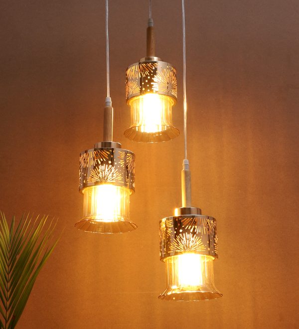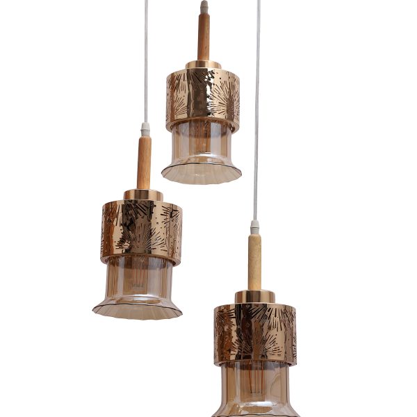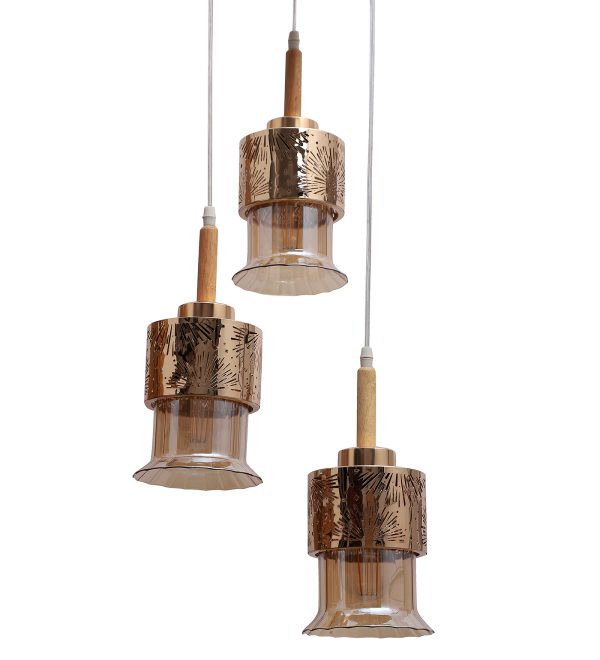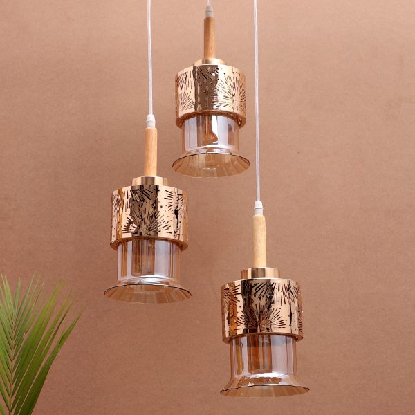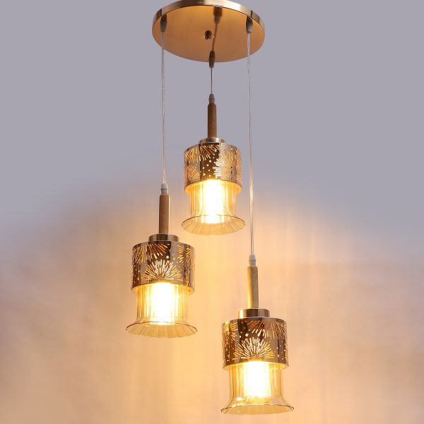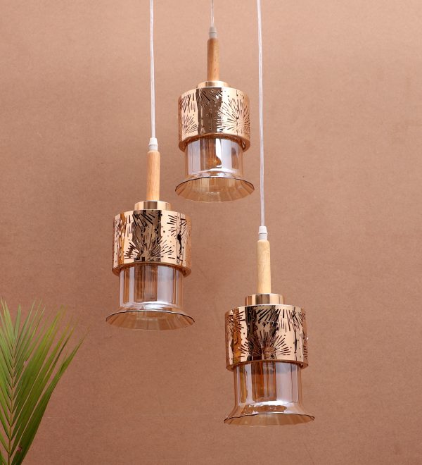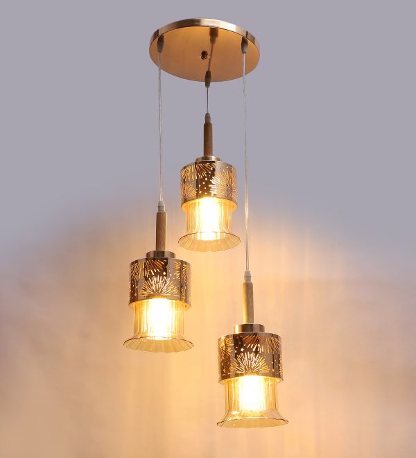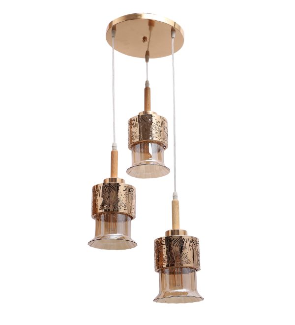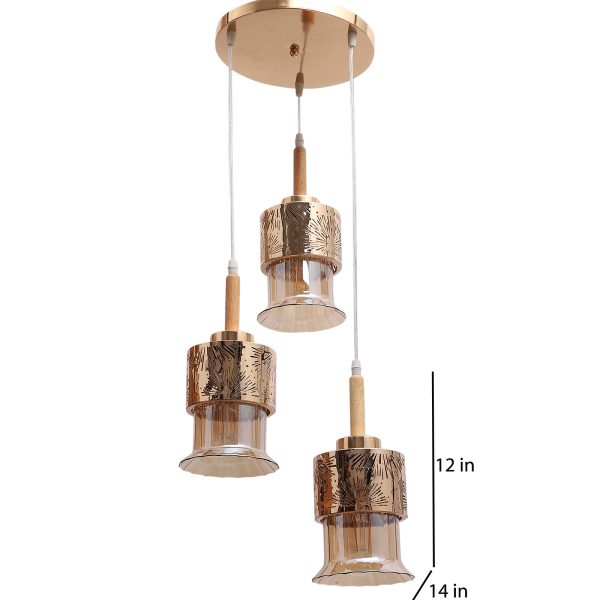 Gold finish tripple hanging light in champaign glass. The suspension can be adjusted at time of installation to the desired height. Can be customized as per requirement. LAMP NOT INCLUDED.