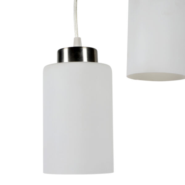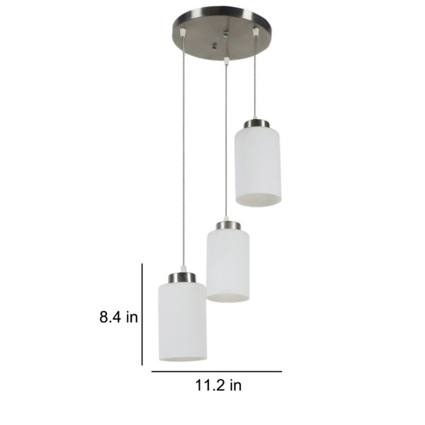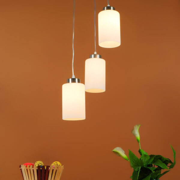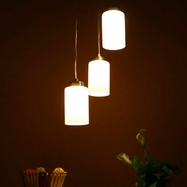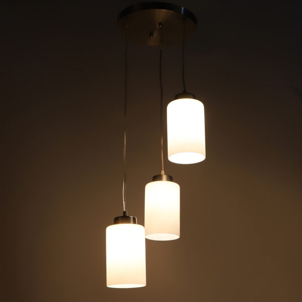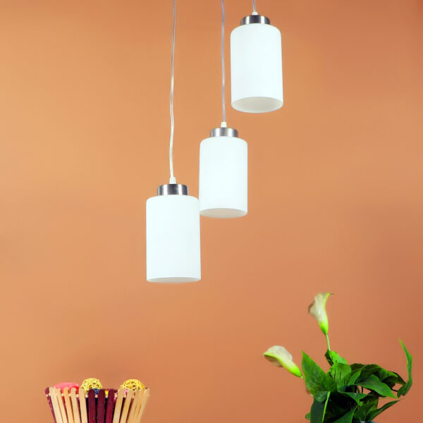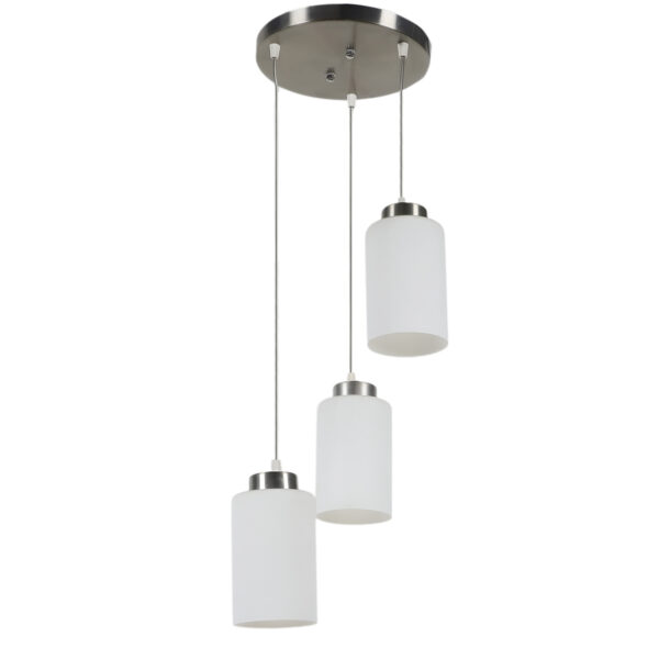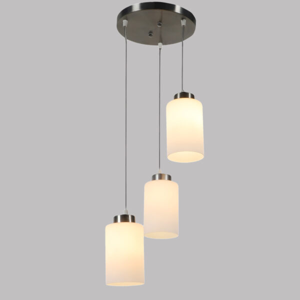Silver (satin nickel) finish, modern cylindrical glass cluster hanging light having three lamps made of mild steel and glass. It is one of the regular design which is never out of trend. The suspension can be adjusted at time of installation to the desired height. It is maintenance free, easy to remove glass and wash them, comes with an E27 holder, only the change of lamp is required, which is available locally everywhere. Application includes both residential and commercial premises wherever it matches with your interiors. Matching single light code – HL3857-1, Matching silver (chrome) finish code HL3860-3, HL3860-1, Matching antique brass finish code – HL3863-3, HL3863-1, Matching dark brown (wood) finish code – HL3859-3, HL3859-1. Lamp not included.