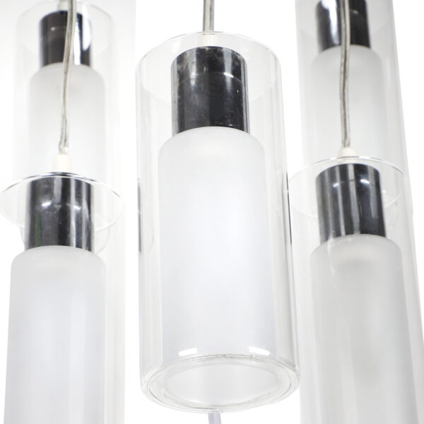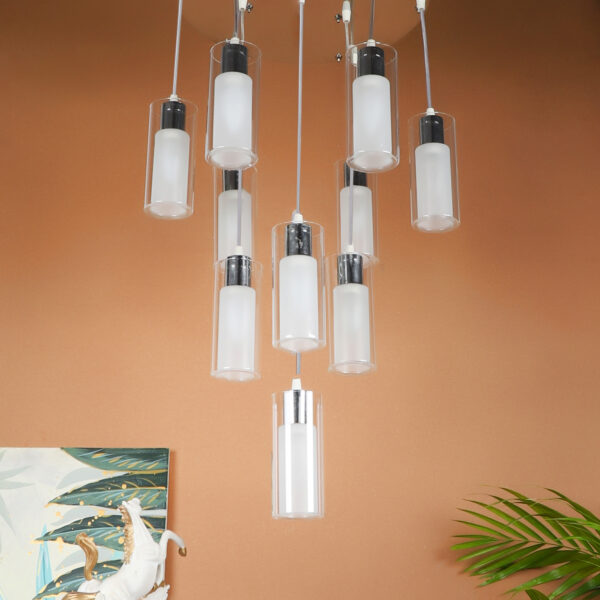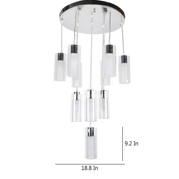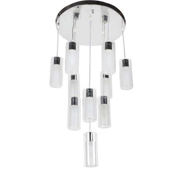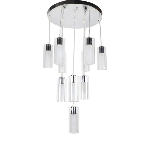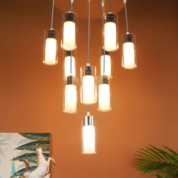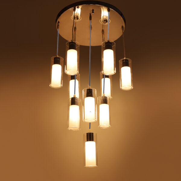 Silver (chrome) finish, ultra modern round glass, cluster hanging light having ten lamps made of mild steel and glass. Each light is having two layers in glass, inner glass is frosted and outer glass is transparent making this light unique. The suspension can be adjusted at time of installation to the desired height. It is maintenance free, easy to remove glass and wash them, comes with an E14 holder, only the change of lamp is required, which is available locally everywhere. Application includes both residential and commercial premises wherever it matches with your interiors. Matching similar hanging codes – HL3868-1, HL3868-3, HL3868-6. Matching chandelier codes – CH313, CH316, Matching ceiling code – CL412. Matching wall light – WL1338, WL1339. All designs available in dark brown (wood) finish also. Can be customized as per requirement in case of bulk quantities. Lamp not included.