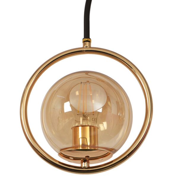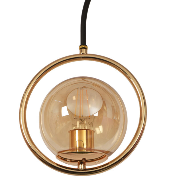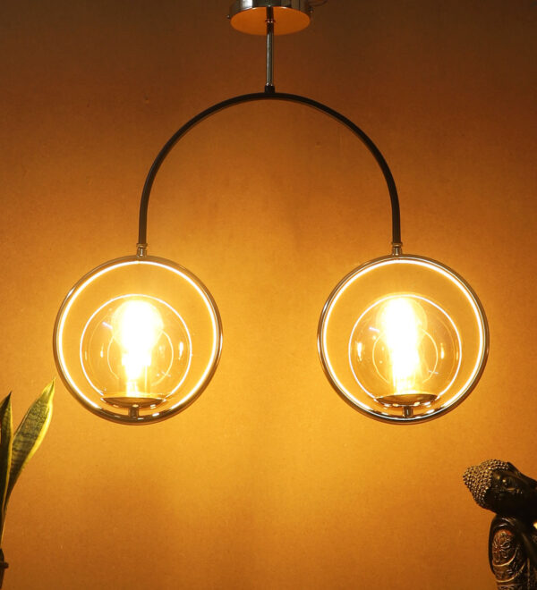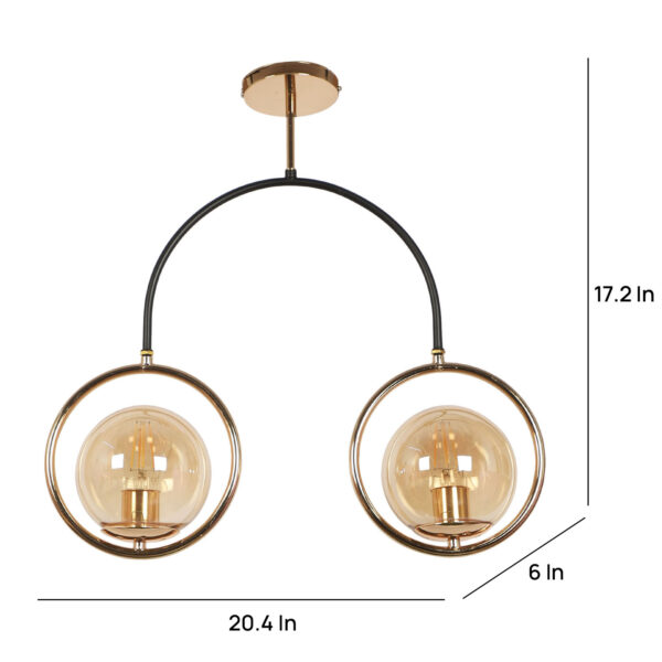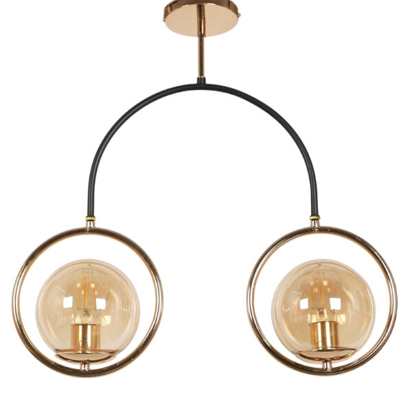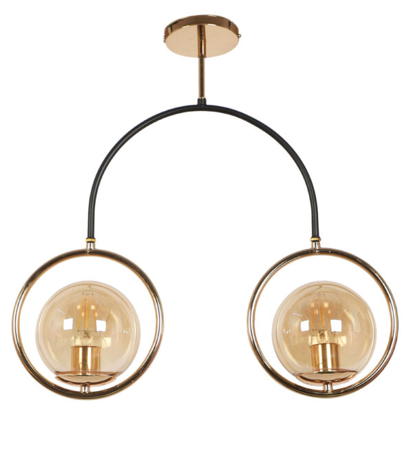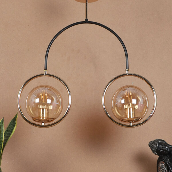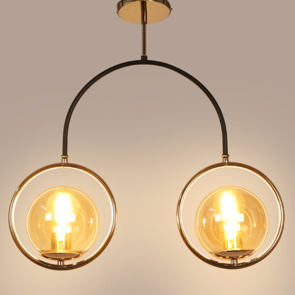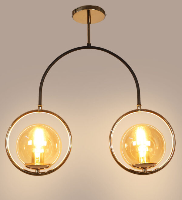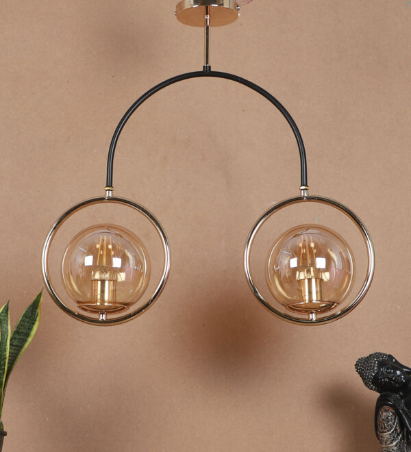 Black and gold modern hanging light having two lights in champaign coloured doom glass. The suspension can be adjusted at time of installation to the desired height. Looks amazing with LED filament lamp. Can be customized as per requirement. LAMP NOT INCLUDED.