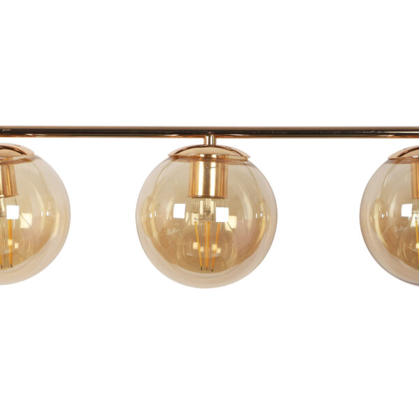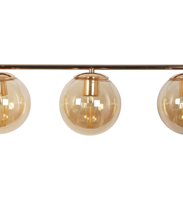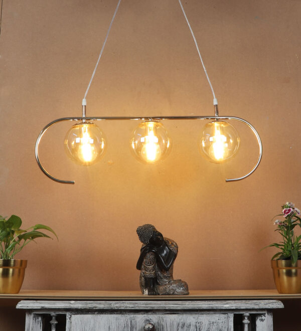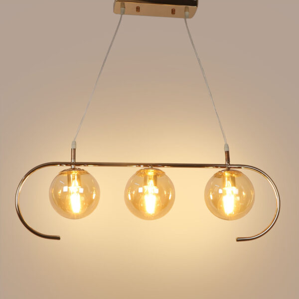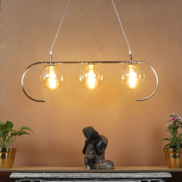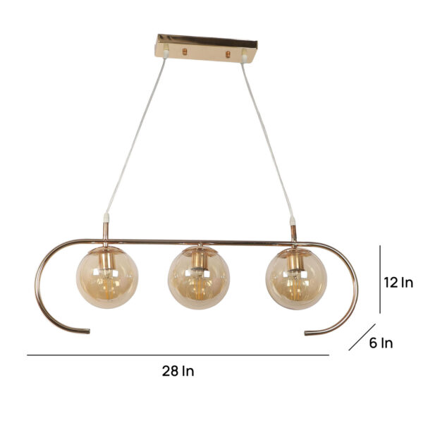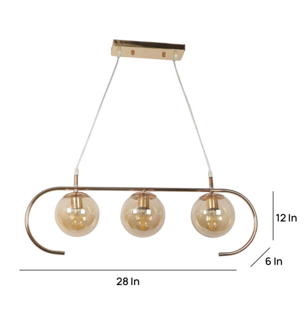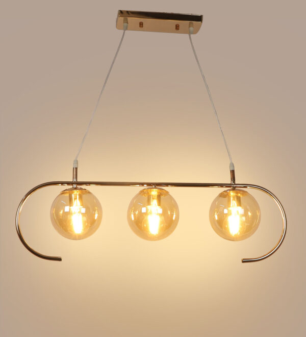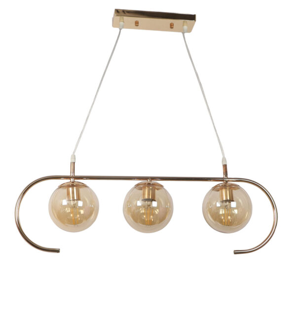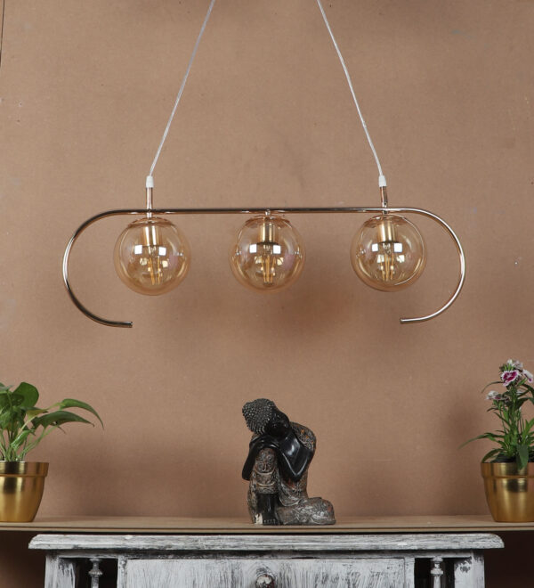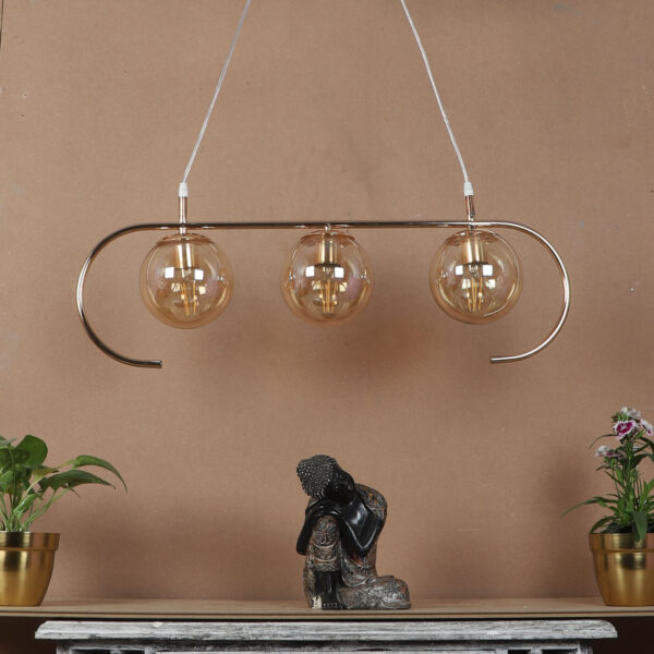 Golden modern hanging light having three lights in champaign coloured doom glass. The suspension can be adjusted at time of installation to the desired height. Looks amazing with LED filament lamp. Can be customized as per requirement. LAMP NOT INCLUDED.