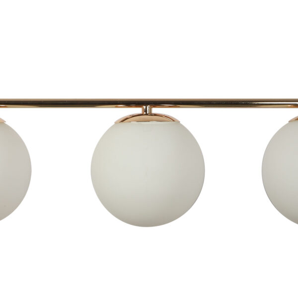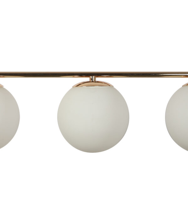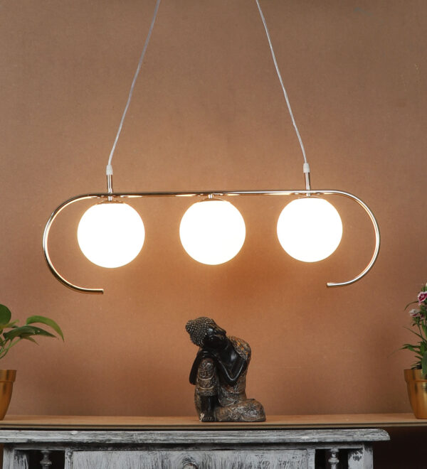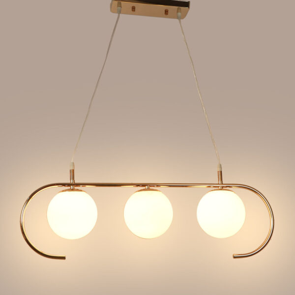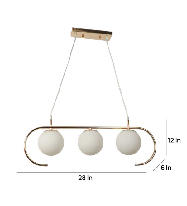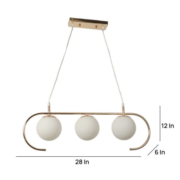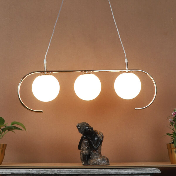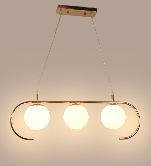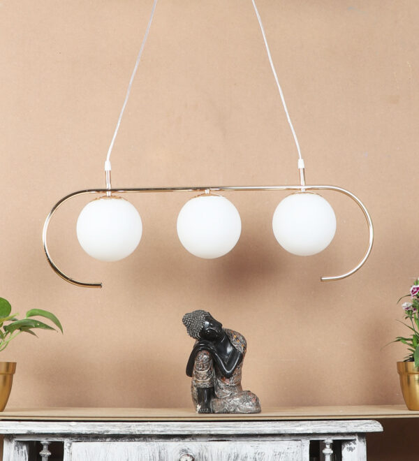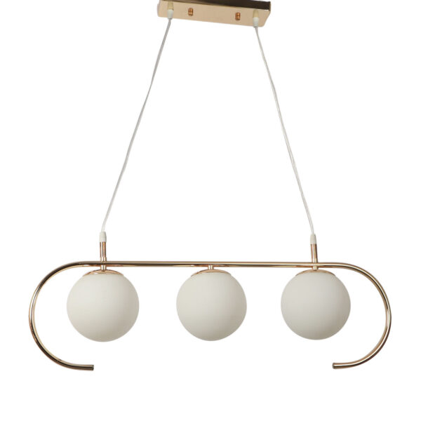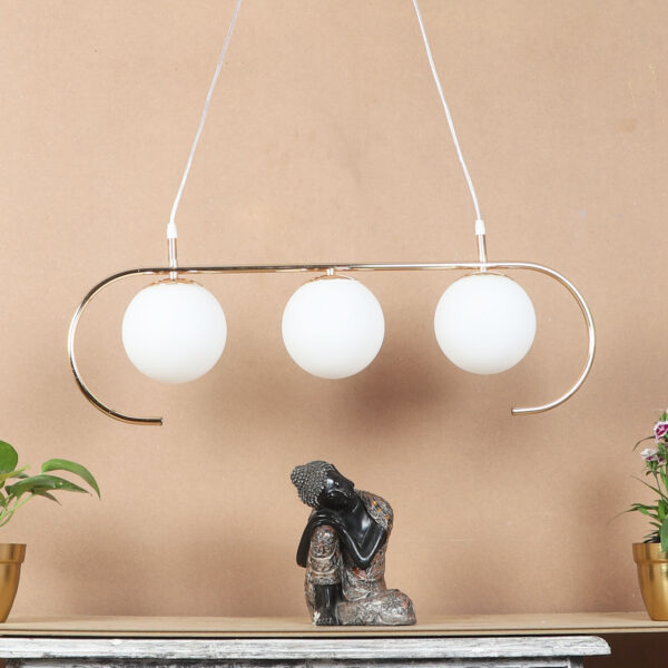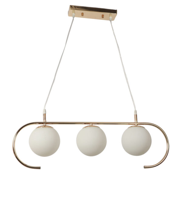 Golden modern hanging light having three lights in white doom glass. The suspension can be adjusted at time of installation to the desired height. Can be customized as per requirement. LAMP NOT INCLUDED.