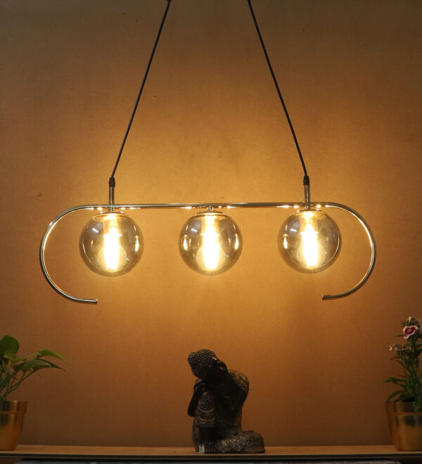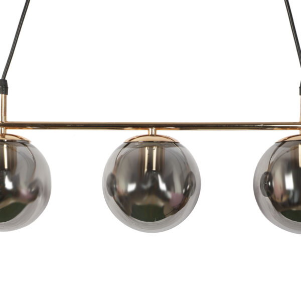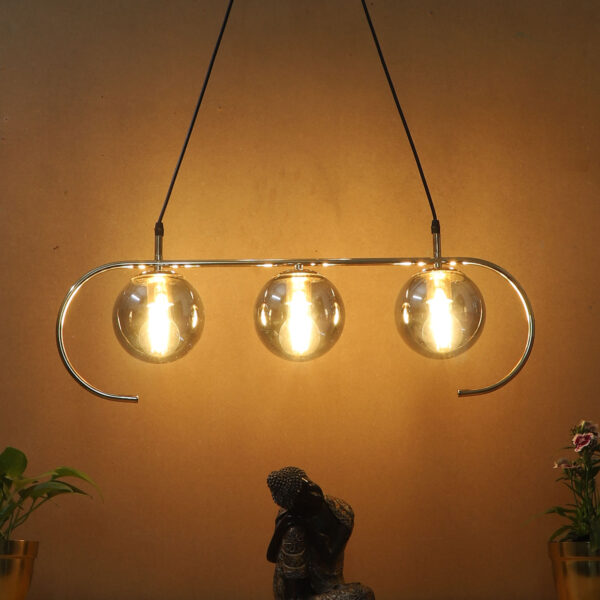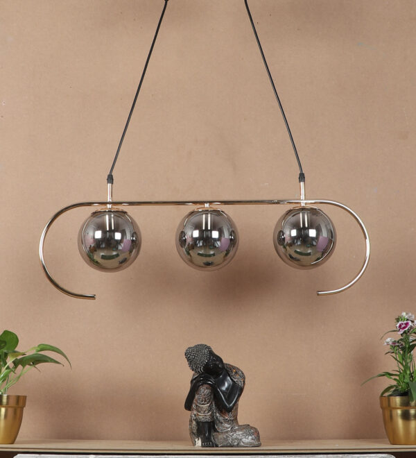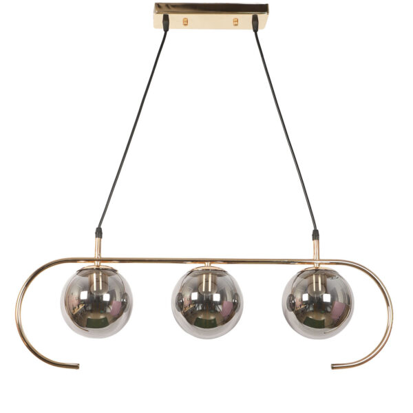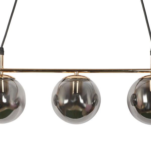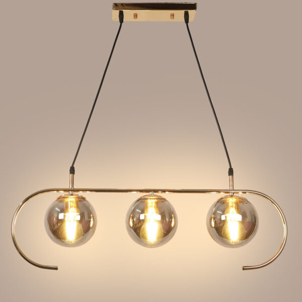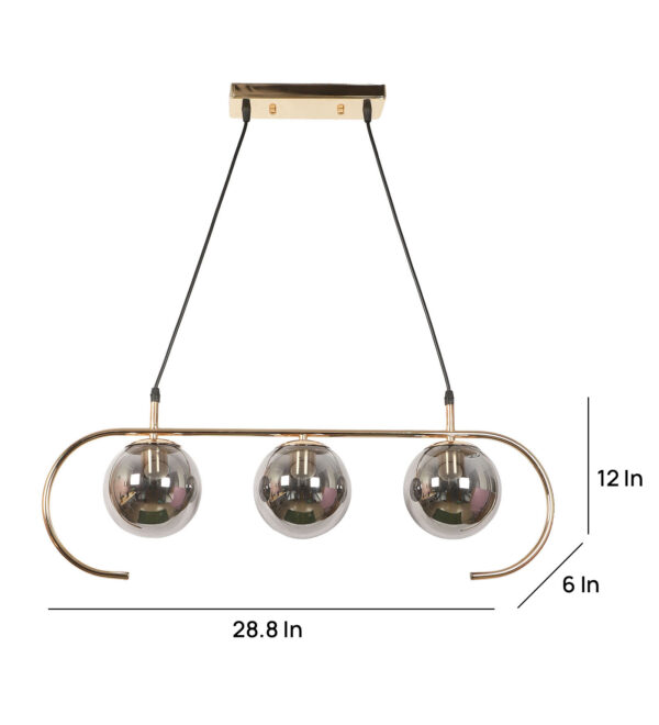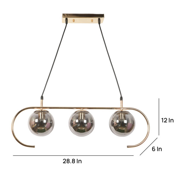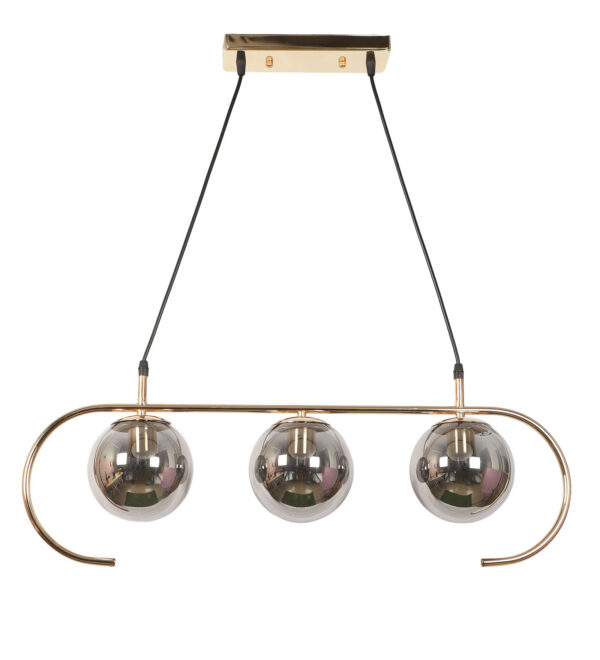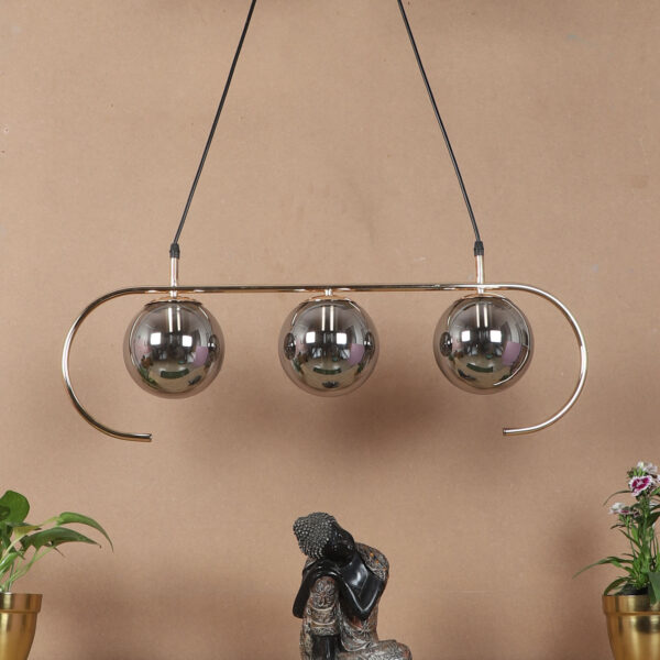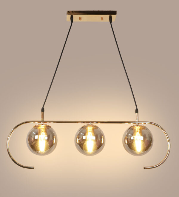 Golden modern hanging light having three lights in smoky doom glass. The suspension can be adjusted at time of installation to the desired height. Looks amazing with LED filament lamp. Can be customized as per requirement. LAMP NOT INCLUDED.