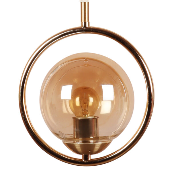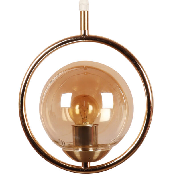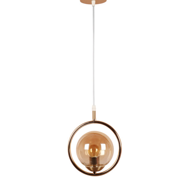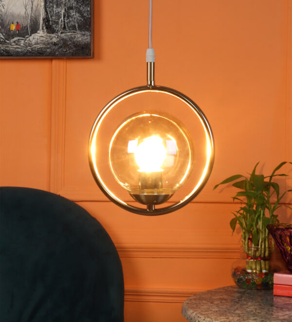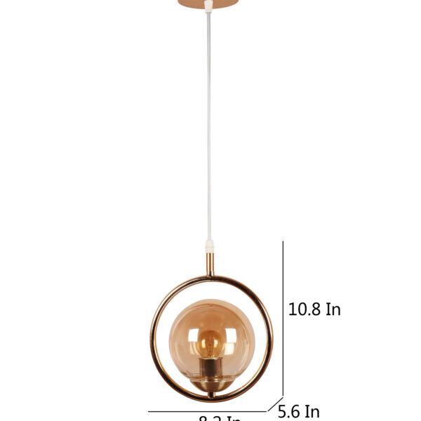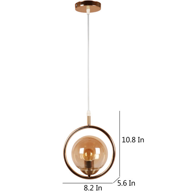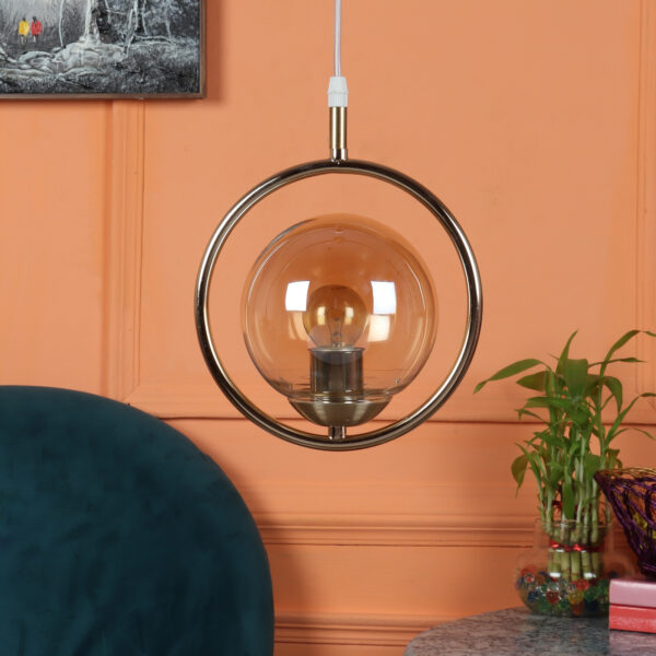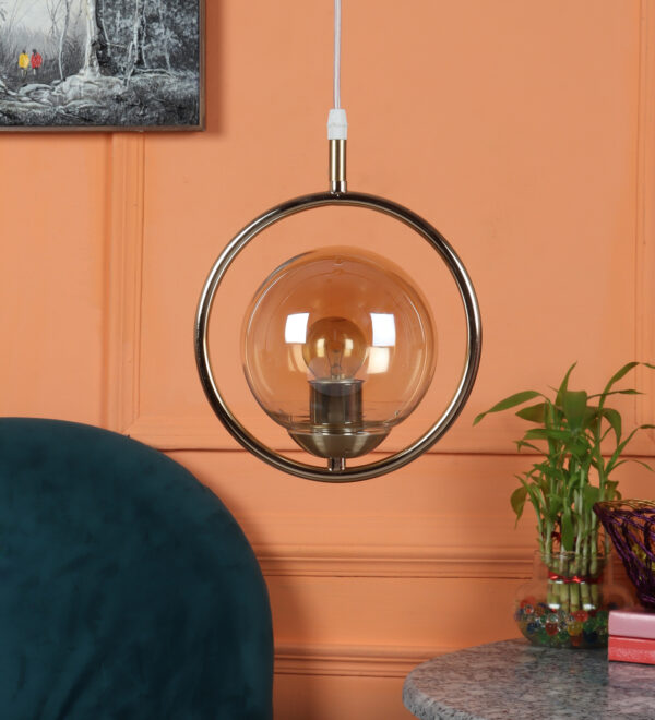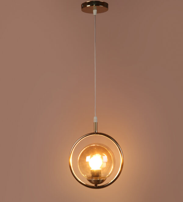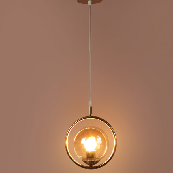 Gold modern mild steel single hanging light in campaign glass. The suspension can be adjusted at time of installation to the desired height. It is maintenance free, comes with an E27 holder, only the change of lamp is required, which is available locally everywhere. LED filament lamp is recommended to enhance its beauty. Matching tripple hanging code – HL6075-3. Application includes both residential and commercial premises wherever it matches with your interiors. Can be customized as per requirement in case of bulk quantities. Lamp not included.