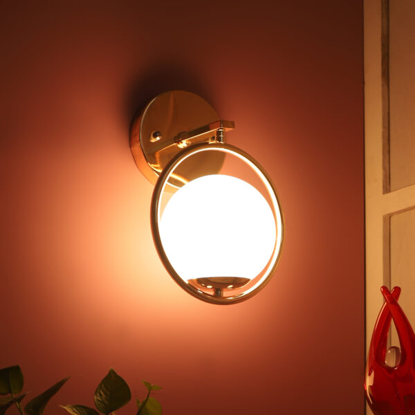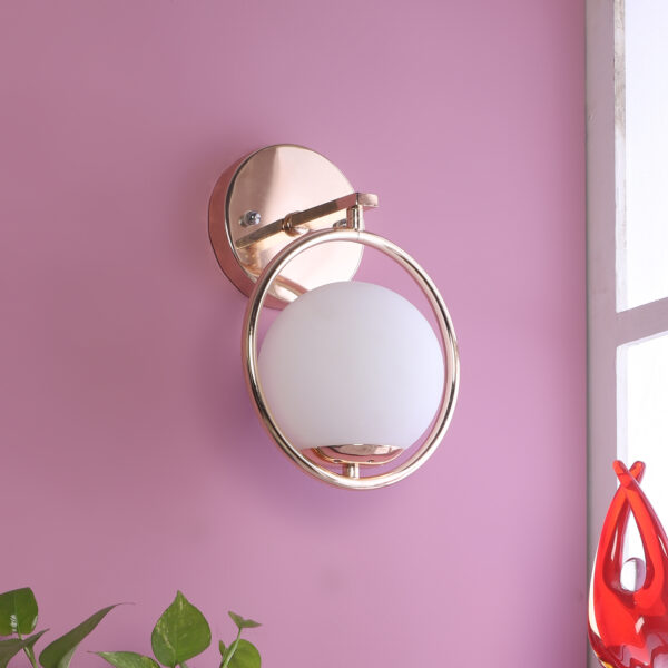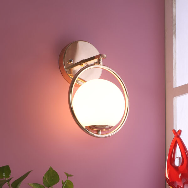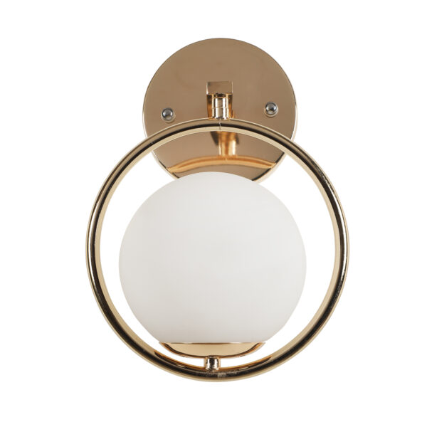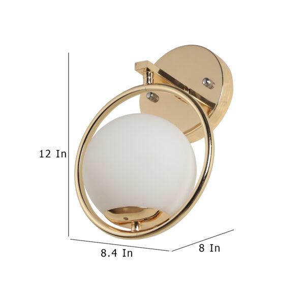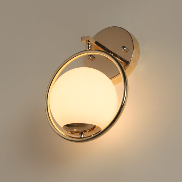 Gold finish single wall light with small round globe (doom) type white glass . It is maintenance free, easy to remove glass and wash it. Comes with an E27 holder, only the change of lamp is required, which is available locally everywhere. Application includes both residential and commercial premises wherever it matches with your interiors.Can be customized as per requirement in case of bulk quantities. Lamp not included.