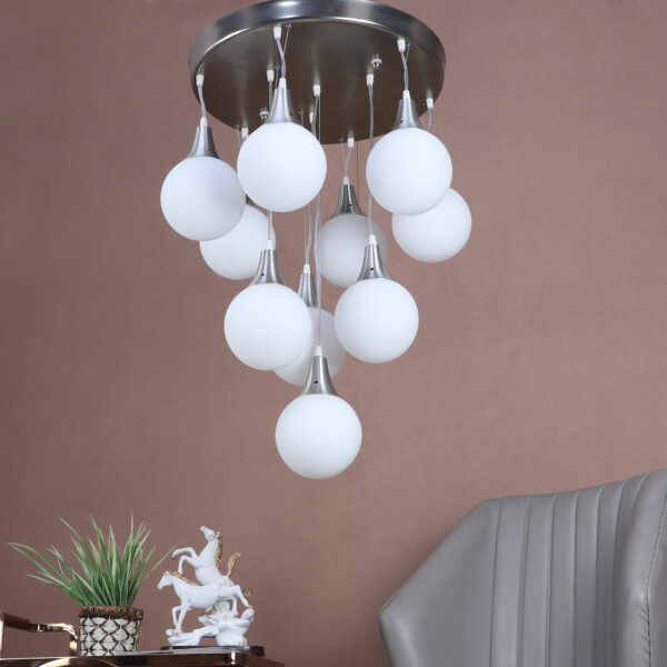 Silver (satin nickel) finish, modern doom (globe) glass cluster chandelier / hanging light having ten lamps made of mild steel and glass. It is one of the regular design which is never out of trend. The suspension can be adjusted at time of installation to the desired height. It is maintenance free, easy to remove glass and wash them, comes with an E27 holder, only the change of lamp is required, which is available locally everywhere. Application includes both residential and commercial premises wherever it matches with your interiors. Matching wall light code – Wl1262, WL1272. Matching hanging light – HL3935-6. Can be customized as per requirement in case of bulk quantities. LAMP NOT INCLUDED.