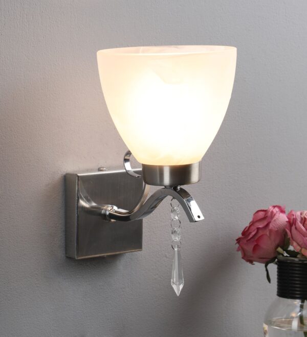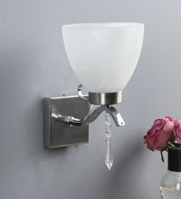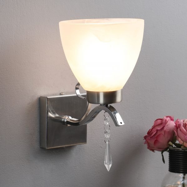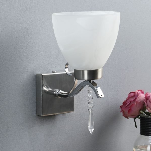 Modern silver (satin nickel,chrome) single wall light made of mild steel having crystals with a tapered heavy glass with self design which looks amazing when lit. It is maintenance free, easy to remove glass and wash it, comes with an E27 holder, only the change of lamp is required, which is available locally everywhere. You can of course swap out the bulb for one that is dimmable, has a higher light output or a different color temperature. Application includes both residential and commercial premises wherever it matches with your interiors. Matching double wall light code – WL1792. Can be customized as per requirement in case of bulk quantities. Lamp not included.