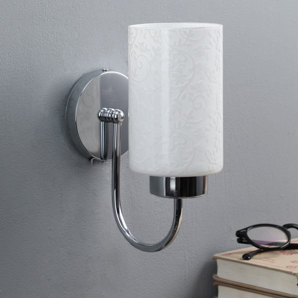 Modern silver (chrome) single wall light made of mild steel with a round cylindrical glass with floral design, which looks amazing when lit. It is maintenance free, easy to remove glass and wash it, comes with an E27 holder, only the change of lamp is required, which is available locally everywhere. You can of course swap out the bulb for one that is dimmable, has a higher light output or a different color temperature. Application includes both residential and commercial premises wherever it matches with your interiors. Matching double wall light code – WL1794. Looks good in down facing direction also. Can be customized as per requirement in case of bulk quantities. Lamp not included.