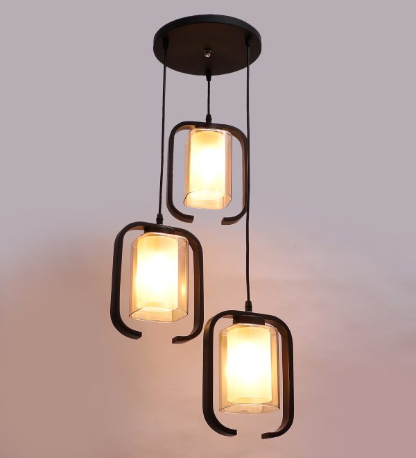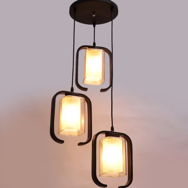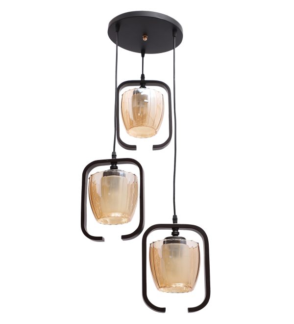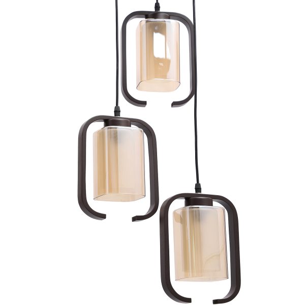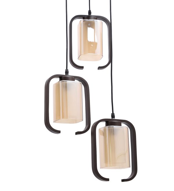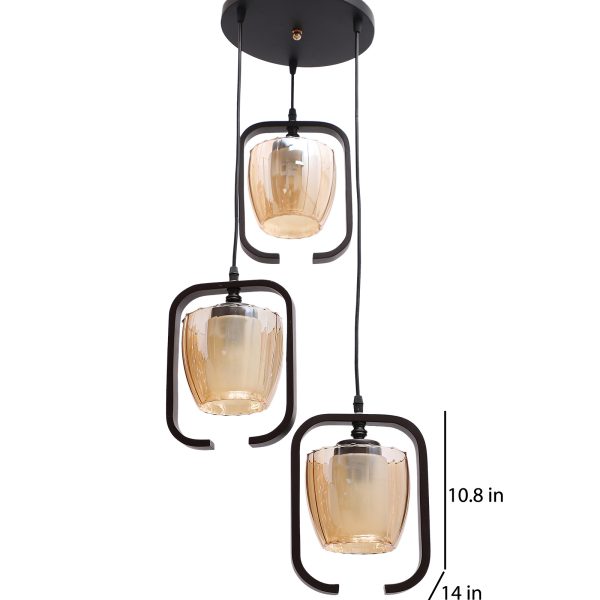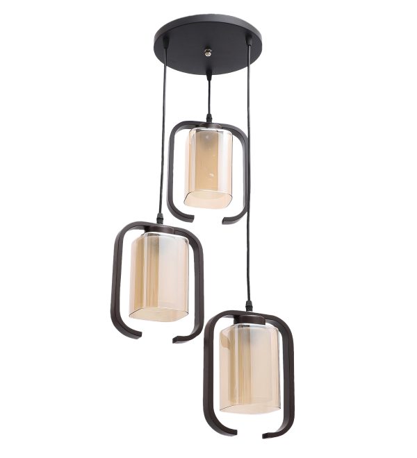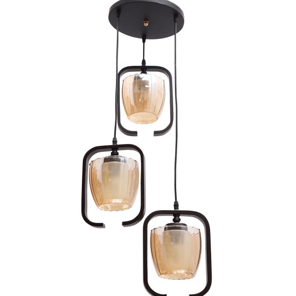 Dark brown (wood) finish, campaign glass tripple hanging light, made of wood, mild steel and glass. The suspension can be adjusted at time of installation to the desired height. Can be customized as per requirement. LAMP NOT INCLUDED.
