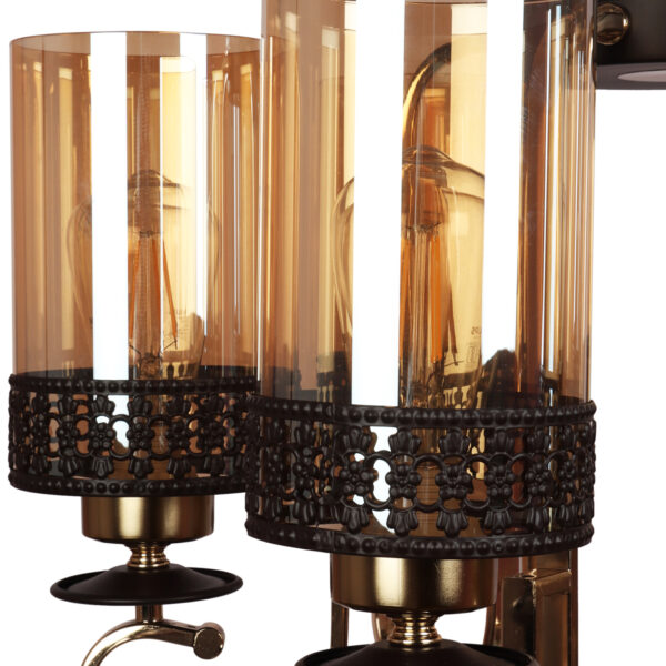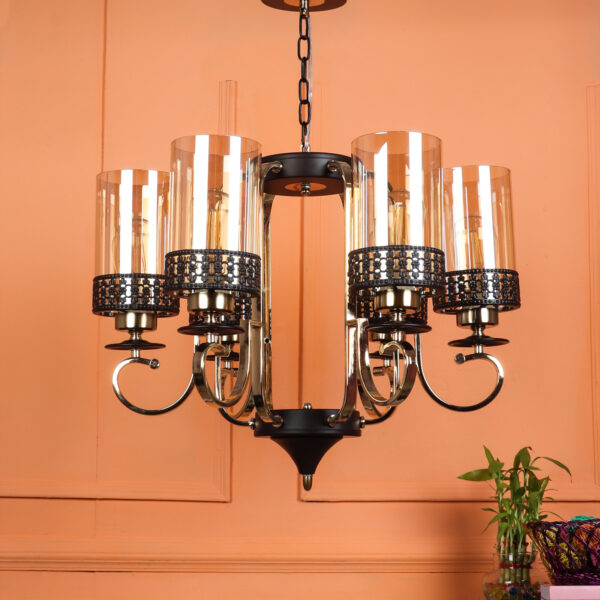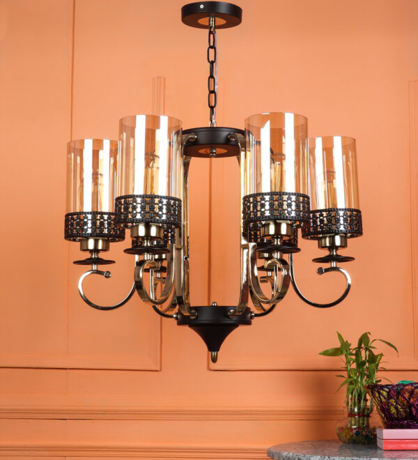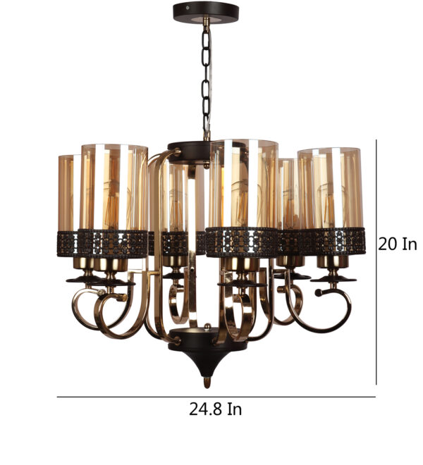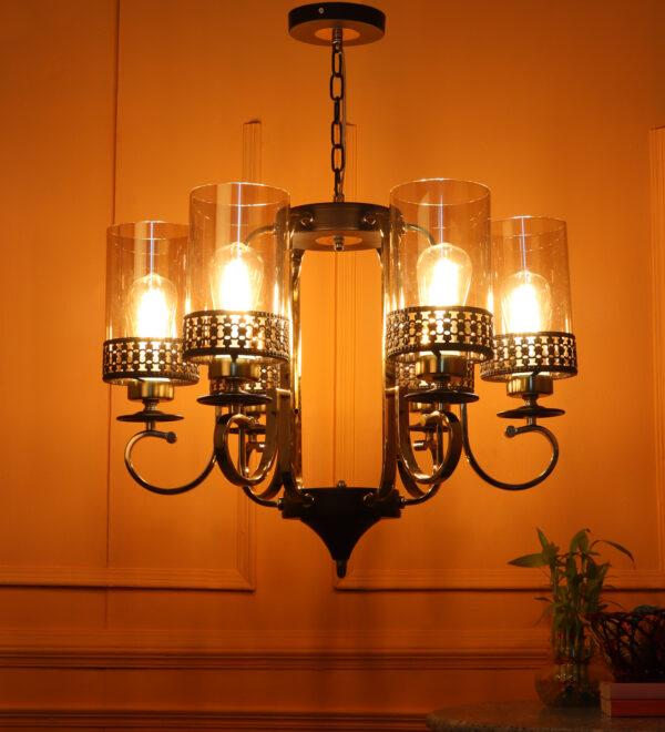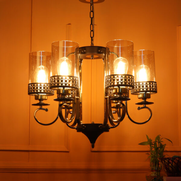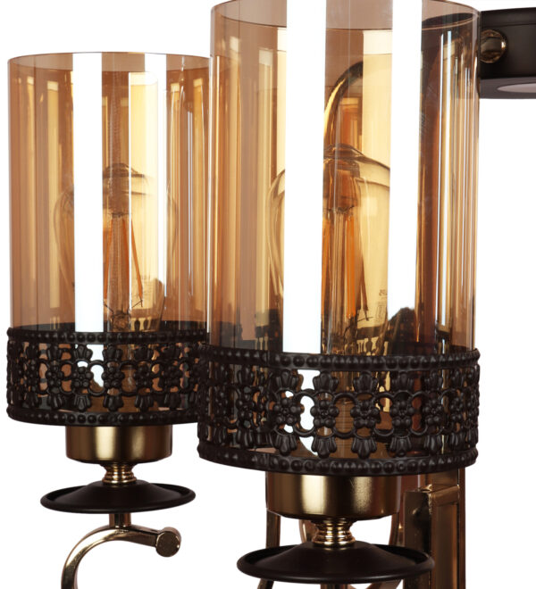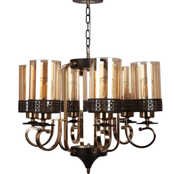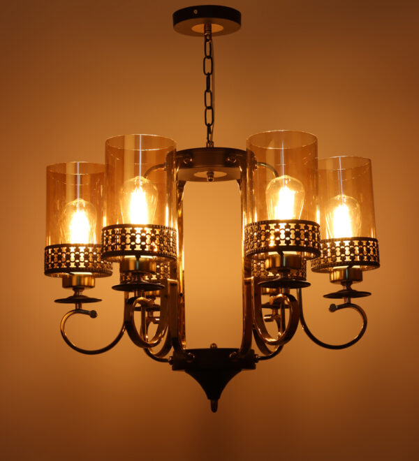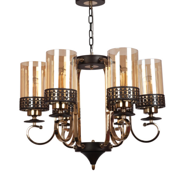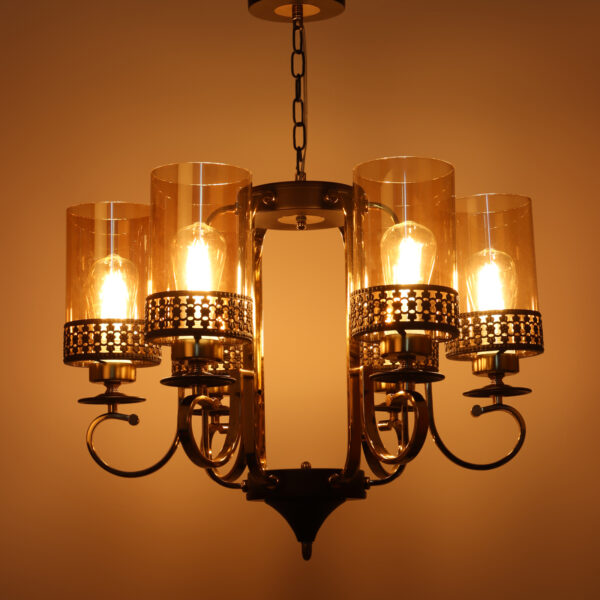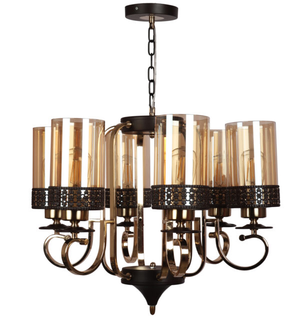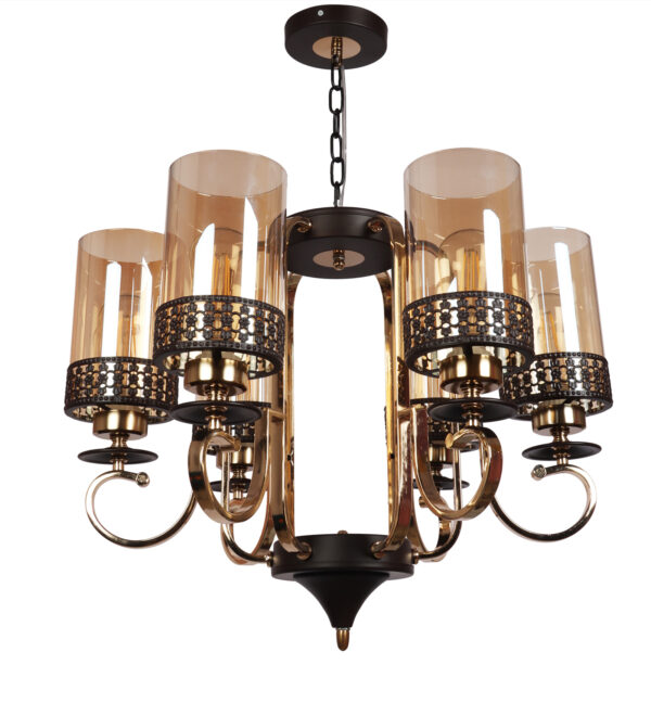 Brown, gold finish, round, cylindrical champagne coloured glass mounted on a designer frame made of mild steel having six lights. This is a hanging type chandelier in which the base plate is fixed to the ceiling with the help of straight clamp and screws. The suspension can be adjusted at time of installation to the desired height. It is maintenance free, it is easy to remove glass and wash them. Comes with an E27 holder, only the change of lamp is required, which is available locally everywhere. Application includes both residential and commercial premises wherever it matches with your interiors. Matching wall light code WL2723, WL2724. Can be customized as per requirement in case of bulk quantities. LAMP NOT INCLUDED.