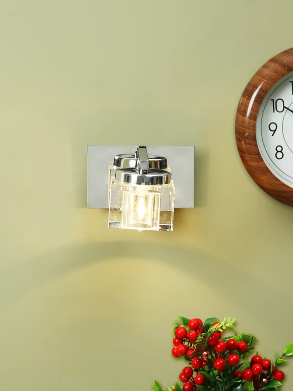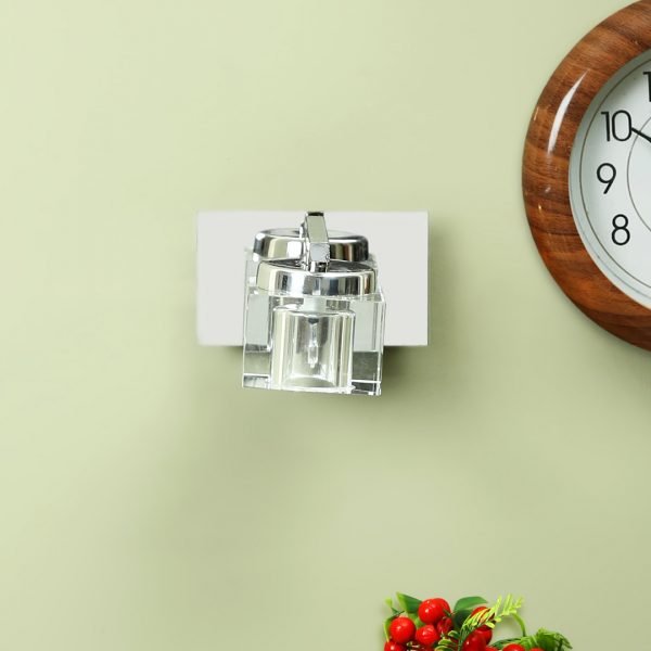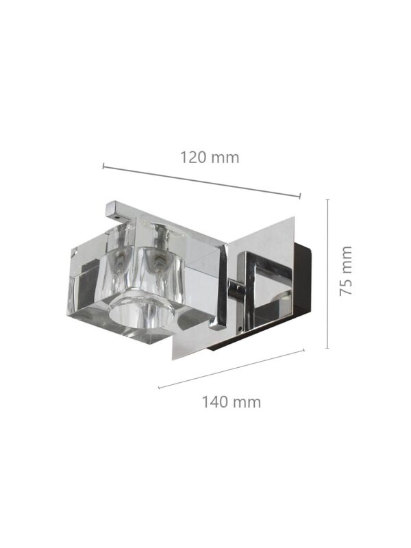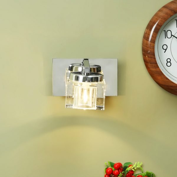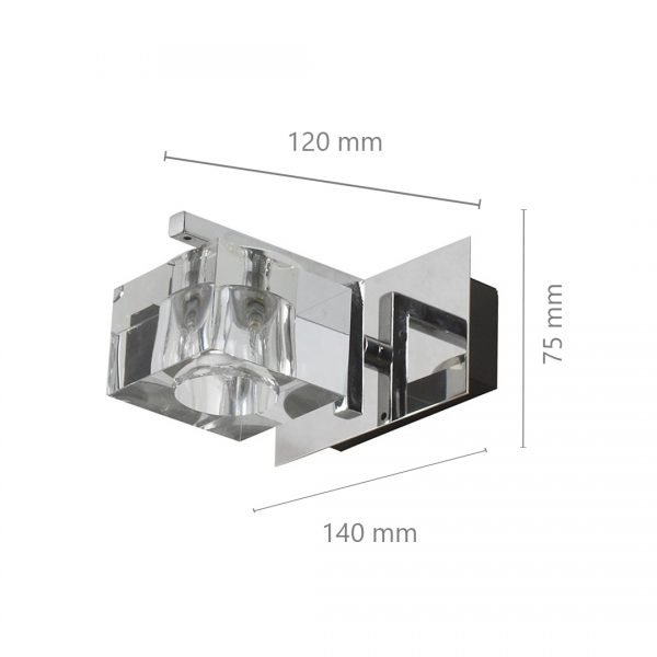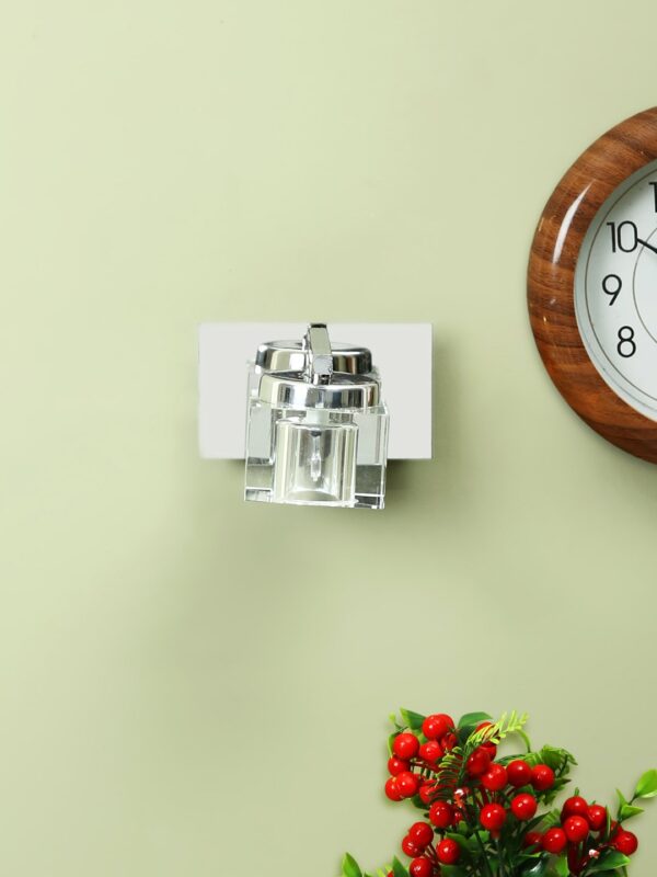 Ultra modern, premium, mild steel silver (chrome) finish, heavy square crystal glass single spot light. Great for installation above a dressing mirror, dressing table, to provide illumination while applying make-up. It can also be used as a wall light, spot light, bed side light, picture light. It is comes with an G4 holder and inbuilt transformer. Matching two light code – ML304-2. Matching three light code – ML304-3, Matching four light code – ML304-4, Matching five light code – ML304-5. LAMP INCLUDED.