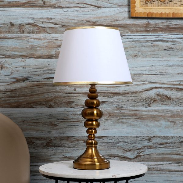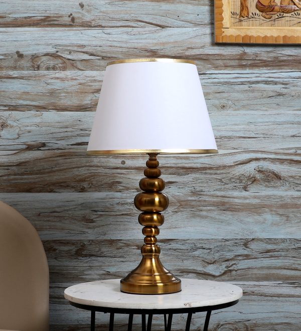 LEARC gold bronze finish table lamp with white shade having golden border. LAMP NOT INCLUDED.