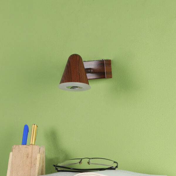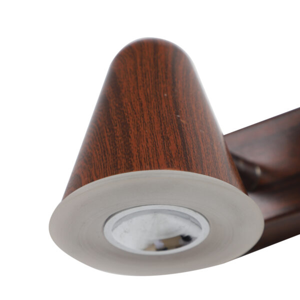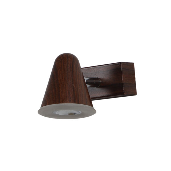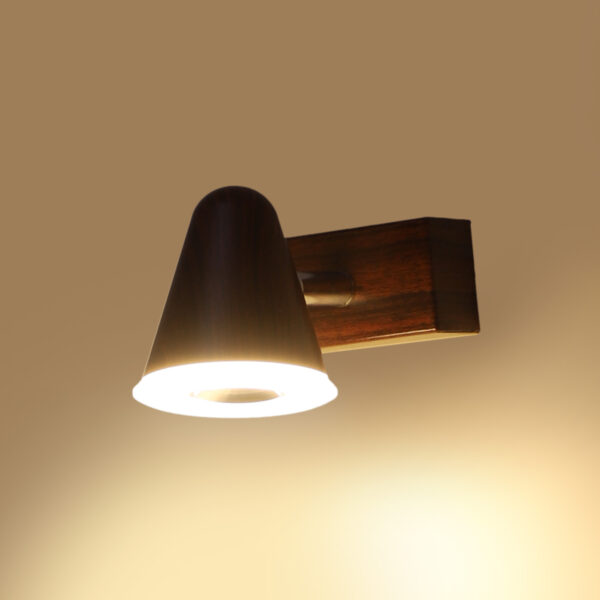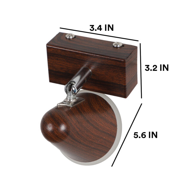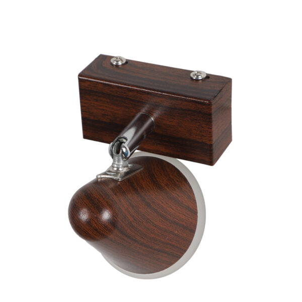 Aluminium, brown (wood finish with grains) single spot light using high quality LED and driver with high success rate having less than 0.5% replacement with warm white (yellow) light output. Great for installation above a dressing mirror, dressing table to provide illumination while applying make-up. It can also be used as a wall light, spot light, ceiling spot light bed side light, picture light. The lighting spot can be adjusted to any required position. Can also be made available in two and three light options. Can be customised as per requirement.