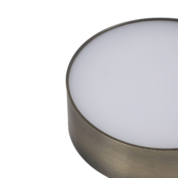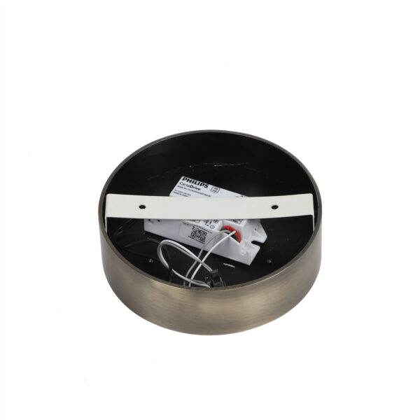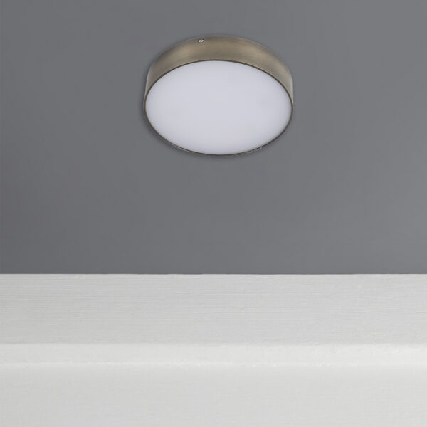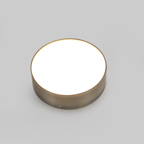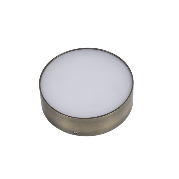 Antique black finish round LED surface ceiling light with warm white (yellow) light output. Can be used both indoors and outdoors. Can be customised as per requirement in terms of body colour, colour of light output and wattage.