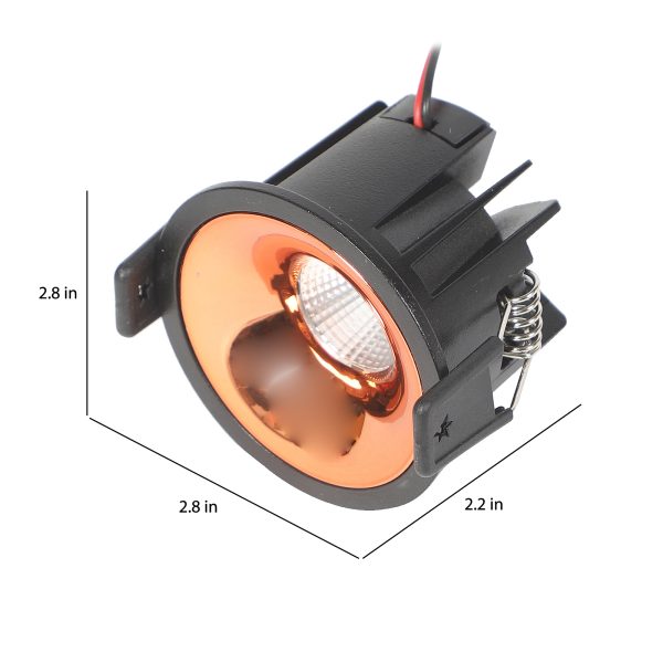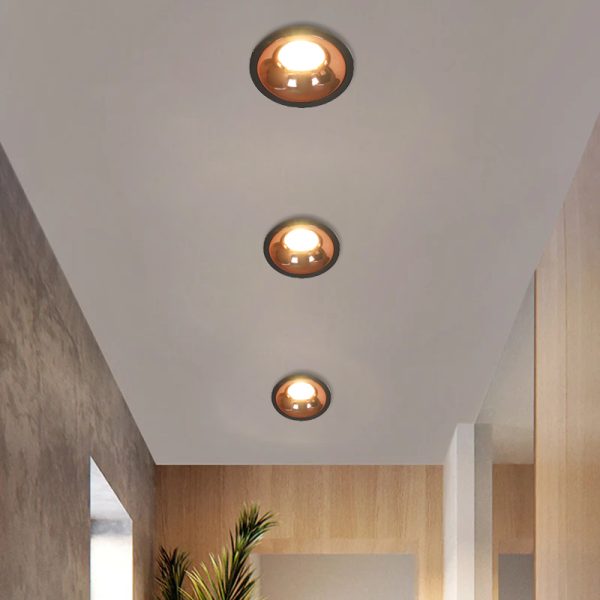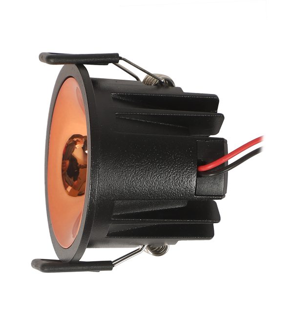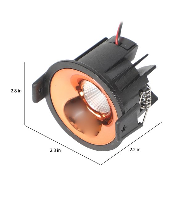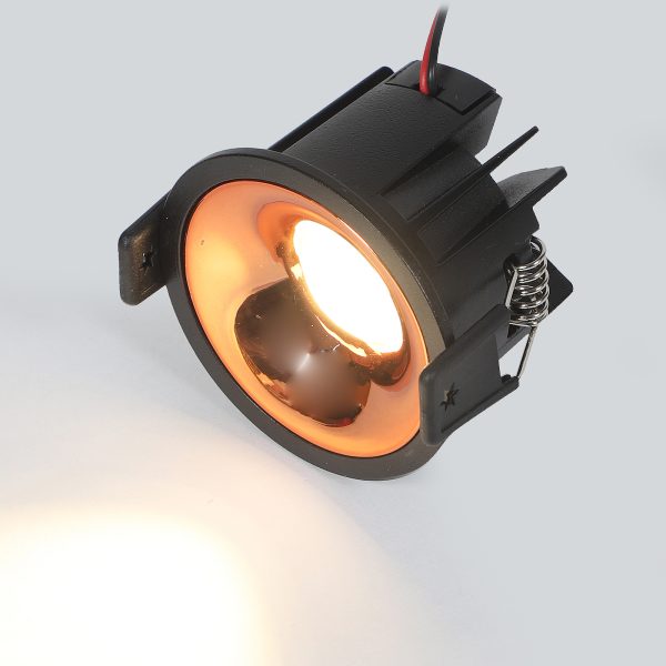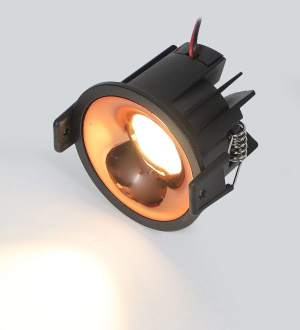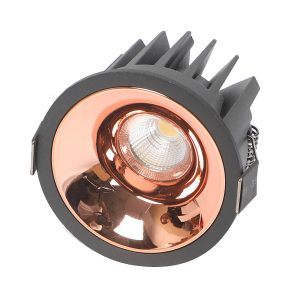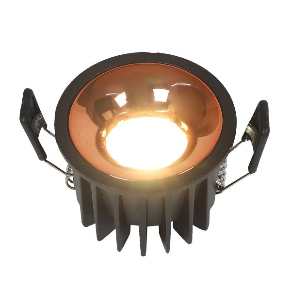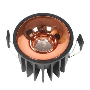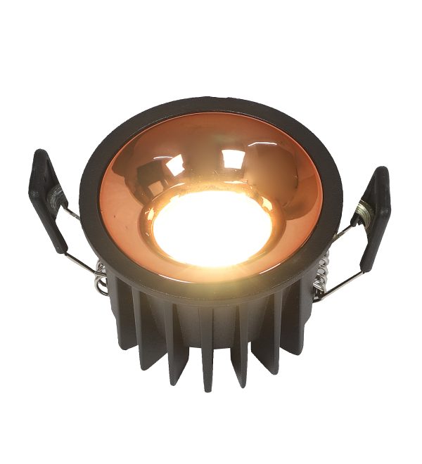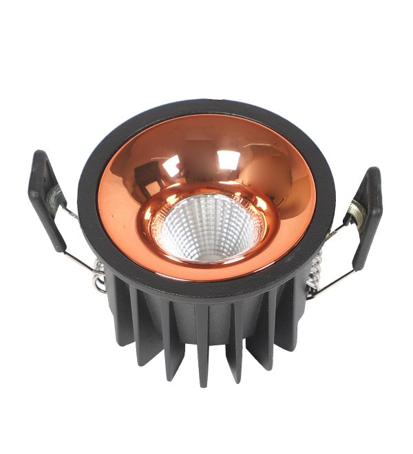 Powder coated black finish with rose gold reflector, aluminium die cast round 7W LED COB concealed ceiling light with top branded Bridgelux LED and Philips or equivalent LED driver. Application includes both indoor and outdoor ceilings. Available in 3000K, 4000K and 6000K ie warm white, nuetral white and white light output.