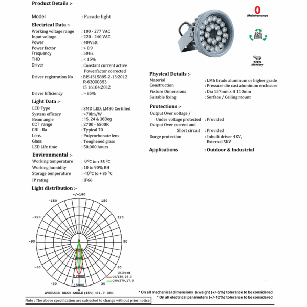 | Beam Angle | 36 degree, also available in 15 and 24 degree on demand |