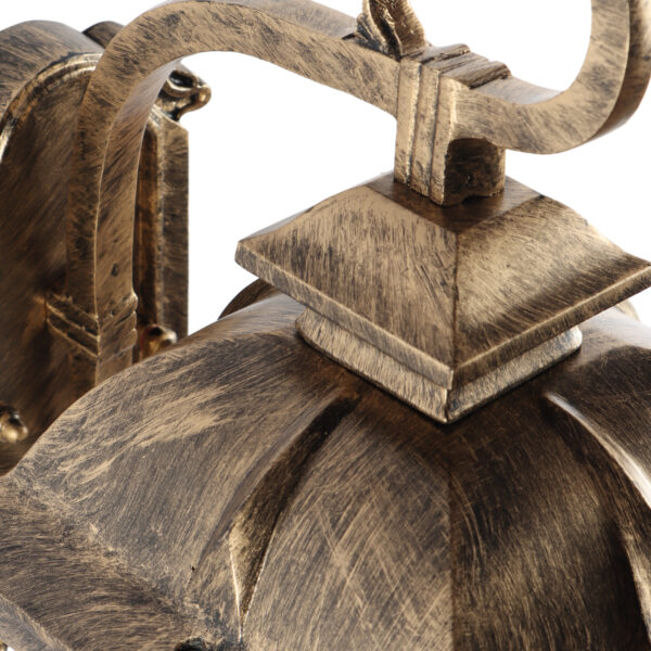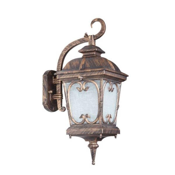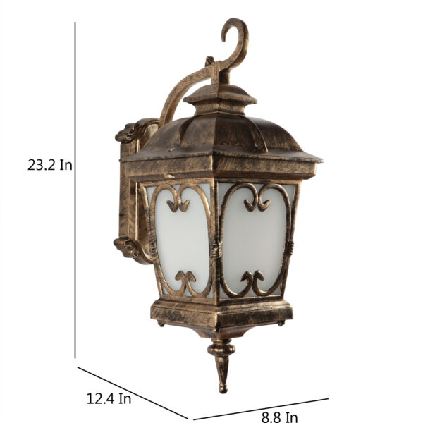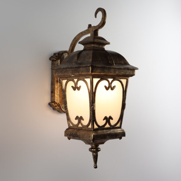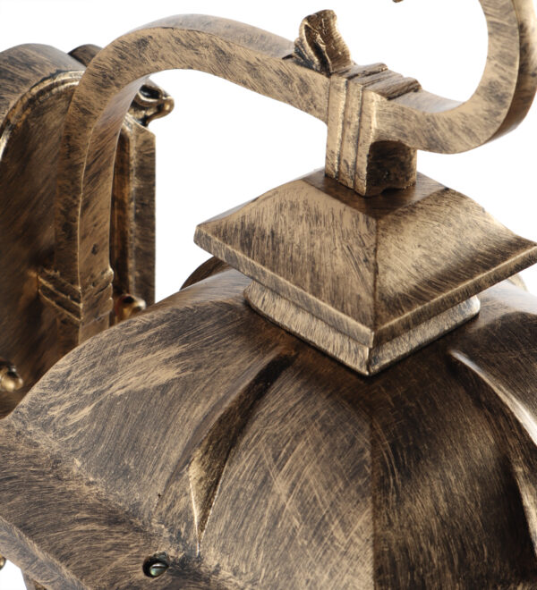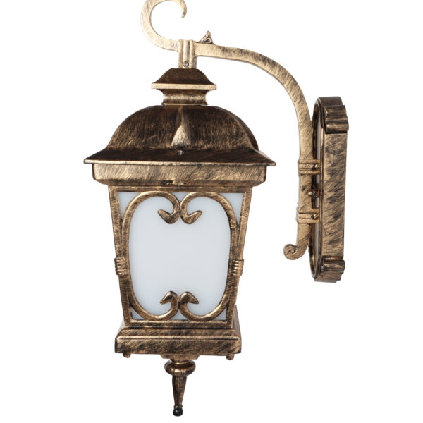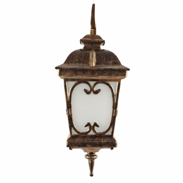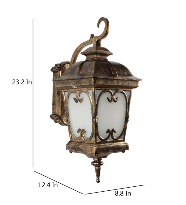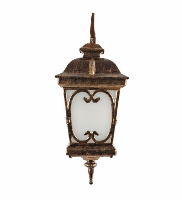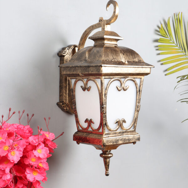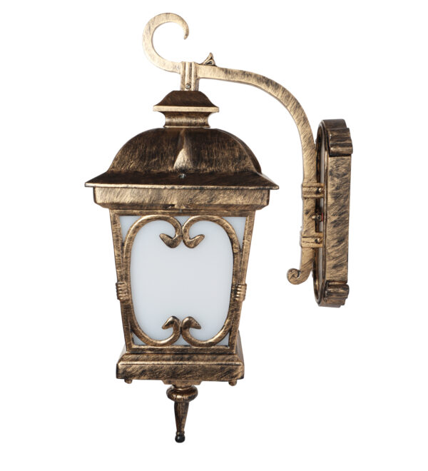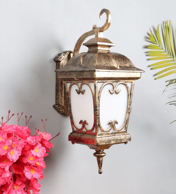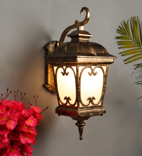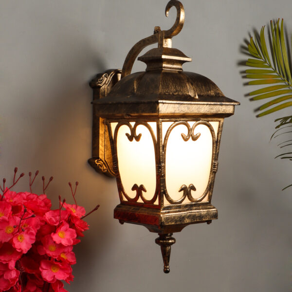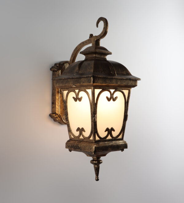 Vertical, heavy, premium, aluminium die cast, export quality traditional down facing outdoor wall light in antique gold finish. It is maintenance free, comes with an B22 holder, only the change of lamp is required, which is available locally everywhere You can of course swap out the bulb for one that is dimmable, has a higher light output or a different color temperature. IP54 rated providing protection from sprayed water in any direction and making this light perfect for use outdoors, Application areas include Stair case walls, passage to staircase, terrace walls, terrace gardens, outdoor walls, boundary walls, open parking, stilt parking, basement parking, balcony , can also be installed indoors, also suits theme restaurants and bars, premium farm houses and party venues. Matching variations in wall light – WL2091, WL2570. Matching Gate Light – GL4555, GL4555-M, GL4555-S. Matching bollard code K1068. LAMPS NOT INCLUDED.